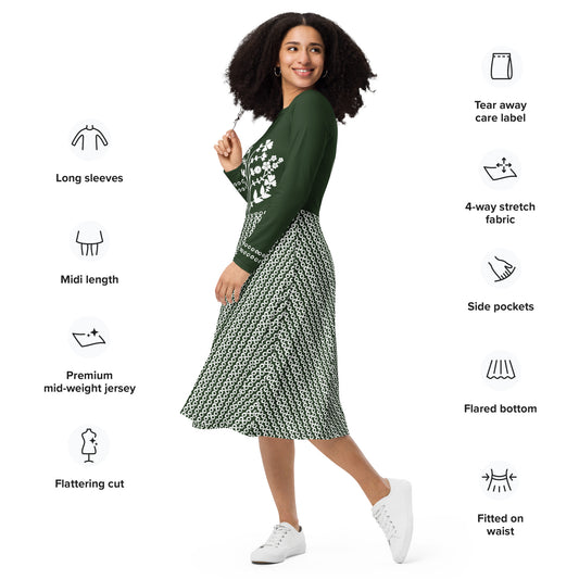 ROOTS! All-over print long sleeve midi dress. FOLKLORE.
